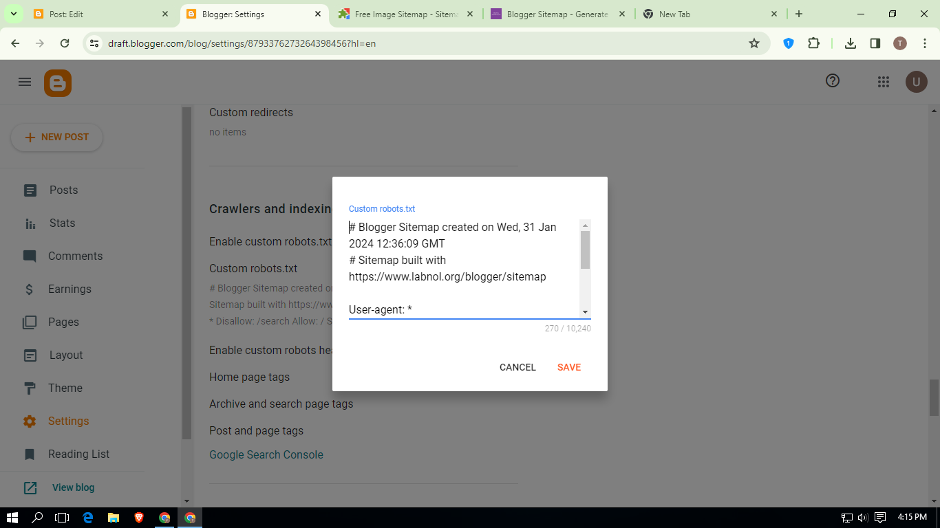 COPY above code and paste into blogger setting tab and click Crawlers and indexing